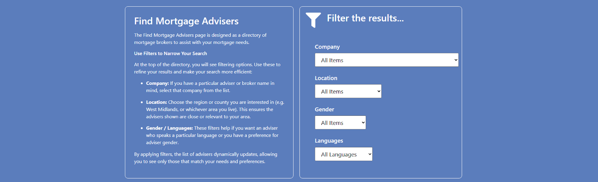Users can filter by company name, location/area, gender, languages spoken, etc. This allows prospects to find an adviser who better matches their needs.